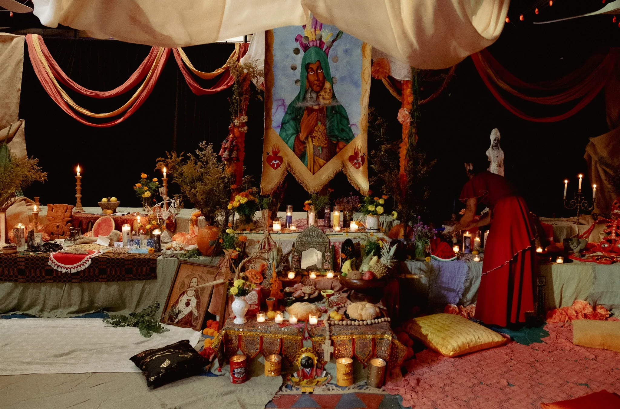 Some of us offer dried and fresh food, objects and fabric with colors of importance, incense, images of loved ones we’ve lost, trinkets from our home that help conjure the energy we need. It only needs to make sense to you.