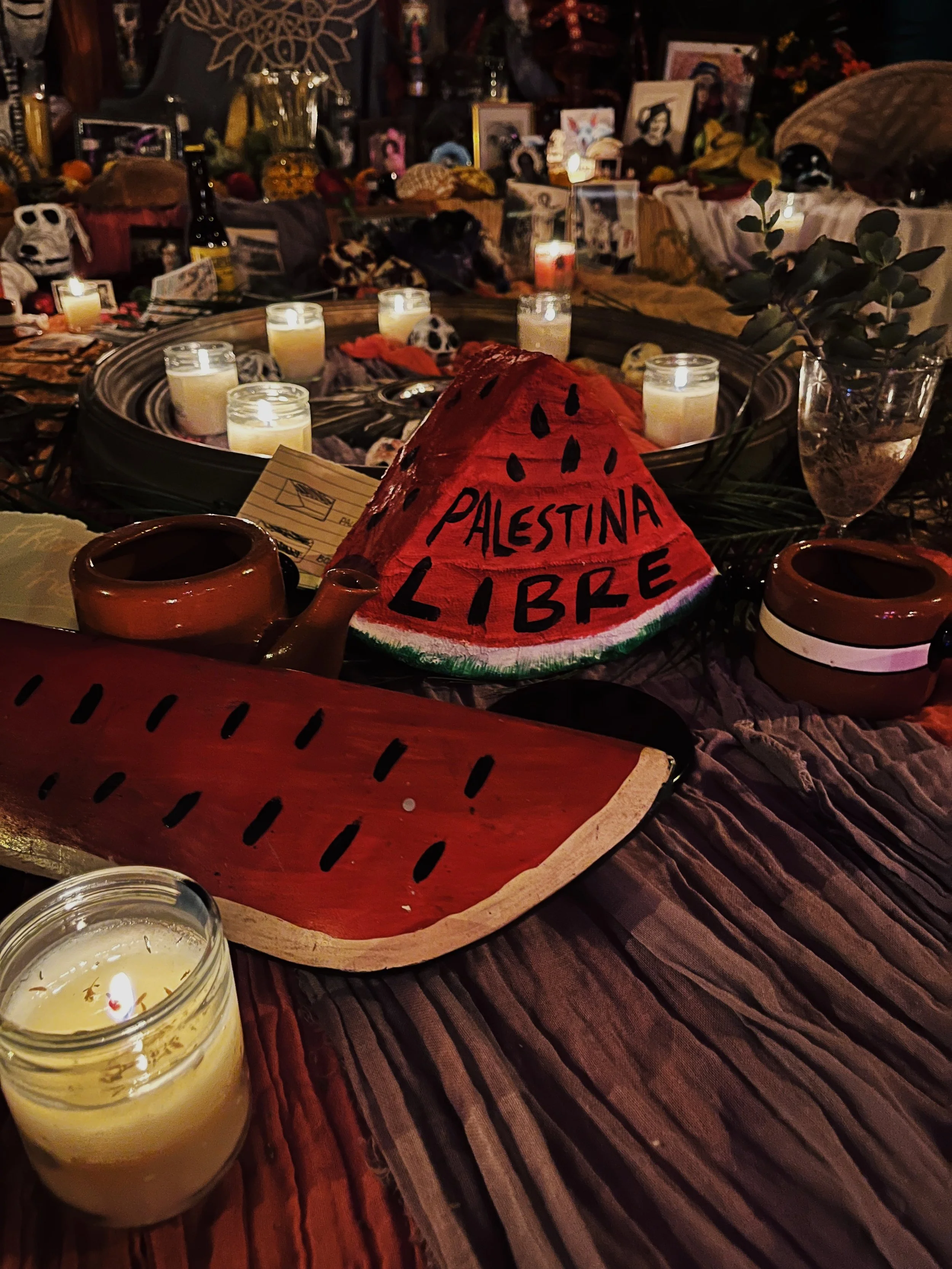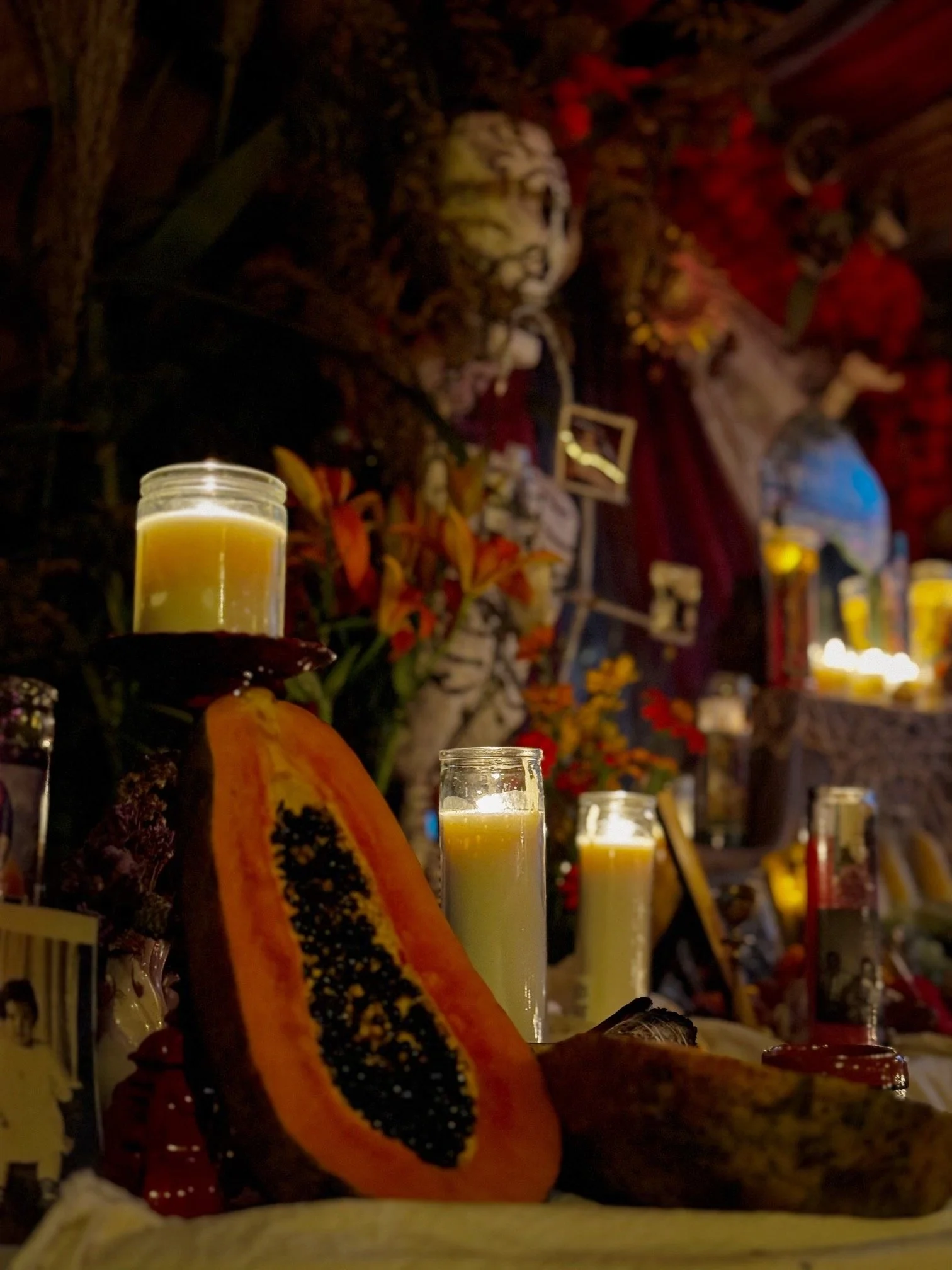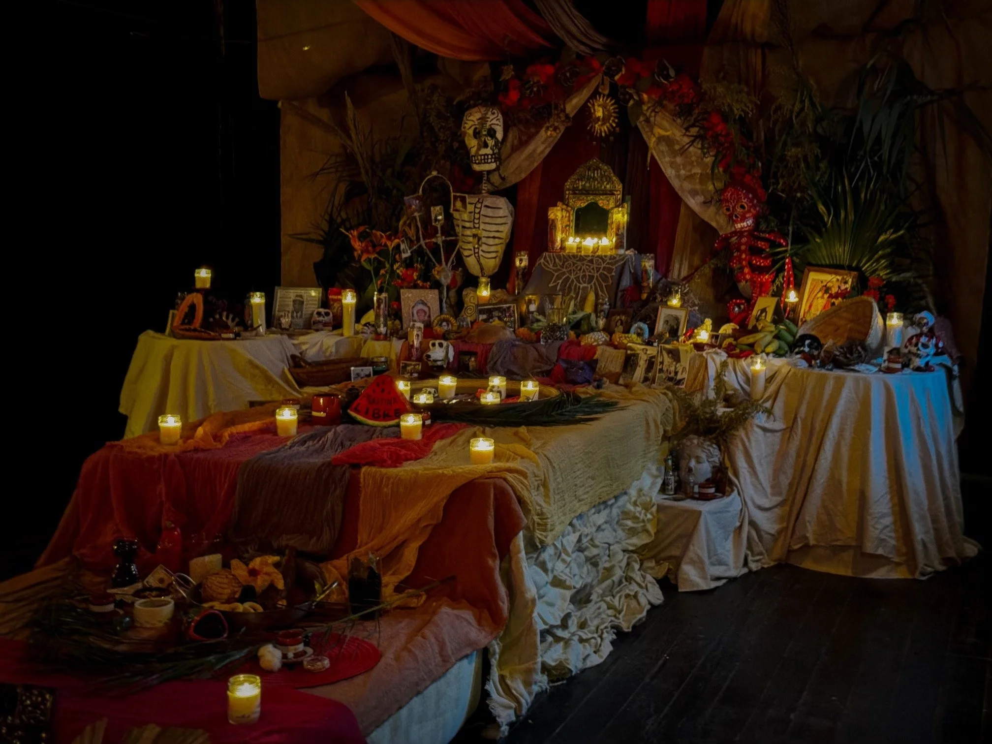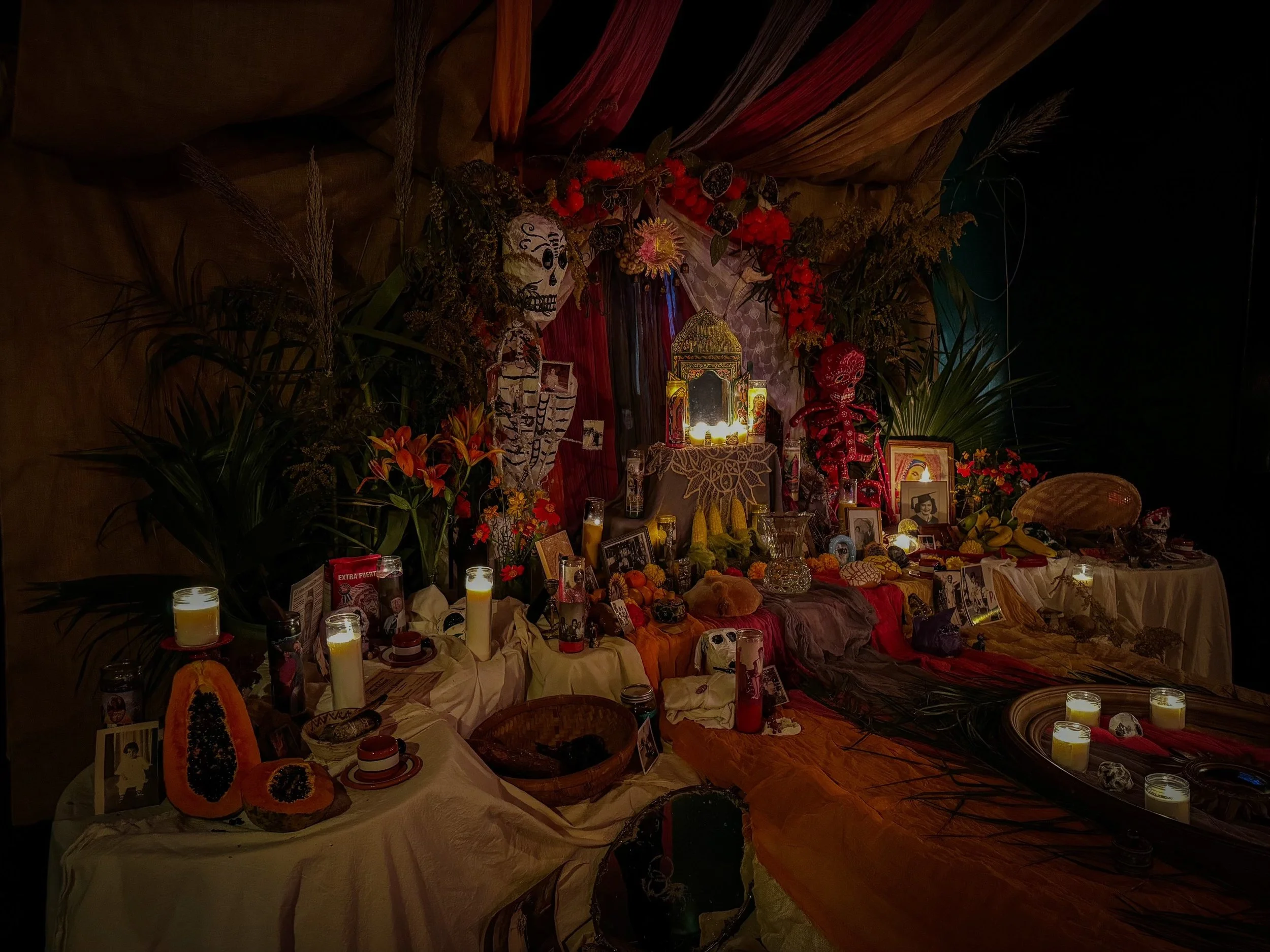 In 2023, Colectiva Manos held a Día de Muertos community altar, our first project as a collaborative. Our altar was a counterbalance to commercialized depictions of Día de Muertos, providing an intimate space for community celebration and remembrance. We invited everyone to bring offerings to add to our altar and share meals with their loved ones. We also provided on-site printing for people without access to printed photos of their loved ones to ensure everyone could contribute to the altar.